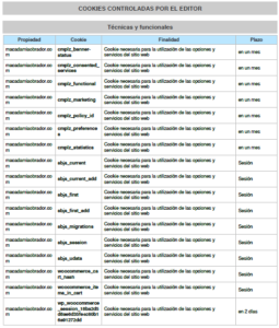 Desde este panel podrá configurar las cookies que el sitio web puede instalar en su navegador, excepto las